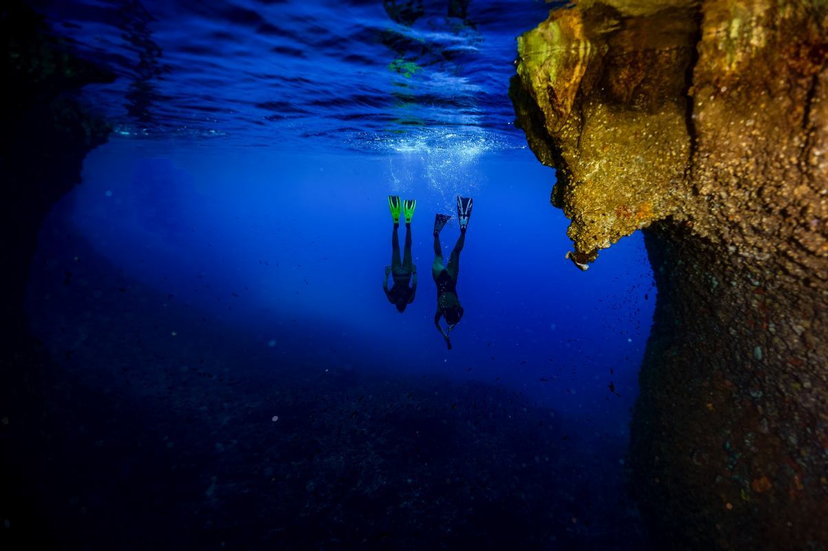 Continuando a nuotare lungo la scogliera rocciosa, alla vostra destra noterete come la parete si curva e, nell’angolo, si apre l’ingresso di una grotta in cui è possibile entrare a nuoto. Ma ciò che questa piccola grotta custodisce sott’acqua è davvero sorprendente! Proprio sotto l’ingresso, a una profondità di circa 7 metri, ondeggia una grande spugna alberello ramificata di colore arancione (Axinella polypoides), una specie rigorosamente protetta, affiancata da altre due più piccole e di una gorgonia gialla. Subito sotto la grotta si distingue una spugna spinosa di colore lilla chiaro (Dysidea avara). Il fondale davanti all’ingresso è ricoperto da alghe rosse calcificate nelle tonalità del rosa chiaro e del giallo tenue, tra grandi massi sotto i quali fanno capolino gialle gorgonie a forma di ventaglio.