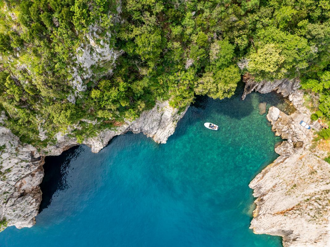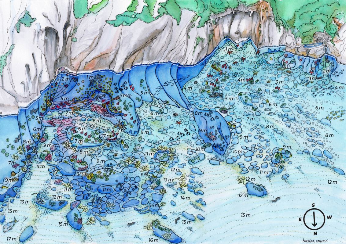 In fondo alla baia noterete una piccola casa di pescatori con lo scivolo per il varo e l’alaggio delle barche. L’esplorazione di questo sito per lo snorkeling inizia subito nelle acque basse — pod zvoni. Il fondale è cosparso di grandi sassi ricoperti di alghe verdi che formano piccole e grandi sfere, mentre le alghe rosse si muovono al ritmo delle onde.